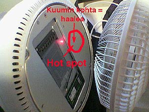 | 3) At this point the problem started to look like being temperature related. To start with, I tried to cool the bottom of the iMac with a blower with the bottom aluminium plate removed, no help, crashed as before: | |||||||||||||||