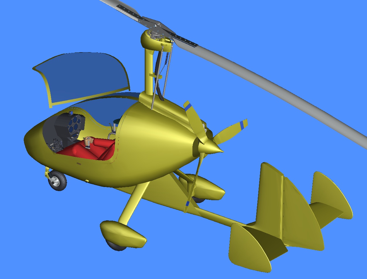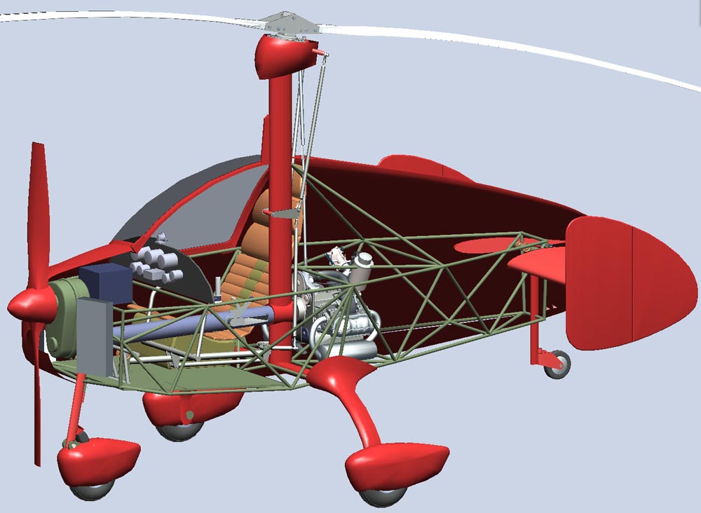 JT-11, a 2-seat tractor gyro with a pusher engine! The JT-11 autogyro concept is a 3D modelling project with the purpose of evaluaiting a side by side tractor gyro design with no compromises in pilot visibility, propeller efficiency, gyro loading or the CG position. Why a tractor? Pusher gyros have two main benefits, good helicopter like visibility from the cockpit and a fairly simple load carrying structure, with all main loads (engine, pilot, fuel tank and main landing gear) attached to the rotor mast. The biggest drawback of pusher gyros is the limited space (between keel tube and rotor) for an efficient propeller. In a tractor gyro one can use an airplane-like big diameter propeller offering a much improved efficiency. Side-by-side seating is a much preferred seating arrangement by many pilots. However, in gyros, pushers or tractors, this arrangement creates a problem with the CG position when the gyro is flown with one very light pilot or with two heavy ones. In tandem gyros this problem is avoided. The pilot balances the engine weight and the passenger is seated right in the CG-position. The gyro can be flown with or without a passenger with minimal CG-shift. With the JT-11 concept I wanted to achieve the following goals: 1) A tractor design with a big, efficient propeller I achieved these goals by placing a part of the power plant (the engine) in the back and another part (propeller, reduction unit, cooling radiators and the battery) in the front of the aircraft. This arrangement balances the empty aircraft so that the longitudinal CG position is right where the pilots are sitting and by placing fuel tanks under the seats all the changing usefull load is in the CG. I am not the first one to figure out this arrangement. Although no such gyros exist today, Harold Pitcairn was the designer of the thirties who extensively used this arrangement in his last gyro designs. The Pitcairn PA-36 or AC-35 (?)