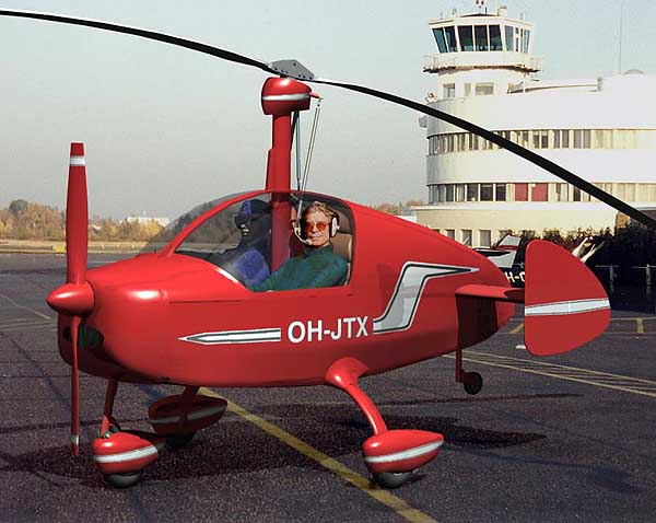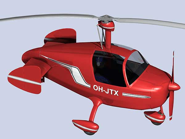 | JT-13B, a side by side design powered by a Rotax 914 engine. This variation was inspired by the availability the 115 hp Turbo Rotax engine. This engine is installed in many 2-seat gyros (like Magni M24, Xenon, etc) but unlike in the other gyros I wanted to try the possibility to install the cooling radiator on the nose of the aircraft. The cooling hoses are inside the aerodynamic casing under the belly. The air flow to the tail planes would be smooth with minimum turbulence and a simple valve in the wall between radiator space and cockpit would provide cabin heating which is a necessity up here in the north. I also wanted to see if the readily available aluminum rotor blades could be installed in the JT-type rotor head. The answer appears to be yes.